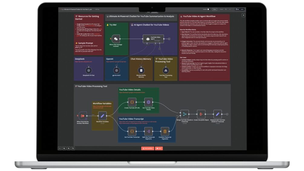 This n8n workflow template allows you to interact with an AI agent that extracts details and the transcript of a YouTube video using a provided video ID. Once the details and transcript are retrieved, you can chat with the AI agent to explore or analyze the video's content in a conversational and insightful manner.